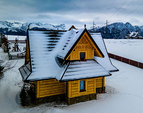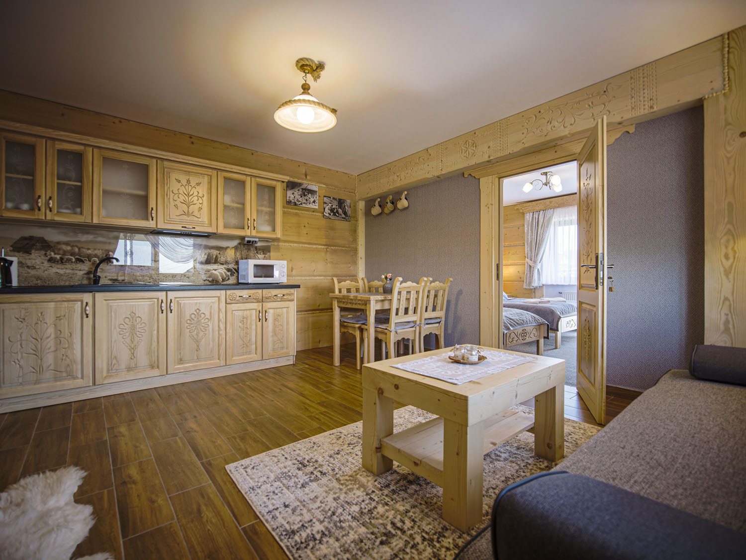 - duża stylowa drewniana góralska izba z kominkiem i otwartym paleniskiem